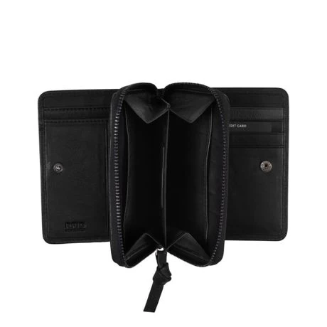 Handzaam formaat portemonnee, uitvouwbaar met drukknopen aan beide zijden. Geschikt voor 5 pasjes met steekvak voor briefgeld en apart ritsvak voor kleingeld met interne vakverdeling.