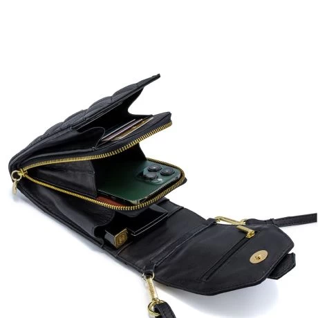 Stijlvol en praktisch telefoontasje van MŌSZ. De tas biedt niet alleen ruimte aan je mobiele telefoon (in alle maten) maar heeft ook 10 kaarthouders met RFID bescherming, wat het skimmen van je pasjes onmogelijk maakt. Daarnaast is er ruimte voor brief- en kleingeld, een speciaal opbergvakje voor je oordopjes en dan nog is er genoeg ruimte voor je dagelijkse ‘kleinere’ spulletjes. Het telefoontasje is op twee verschillende manieren te dragen. Crossbody dankzij de verstelbare en afneembare schouderriem en als handtas dankzij de korte schakelketting.
