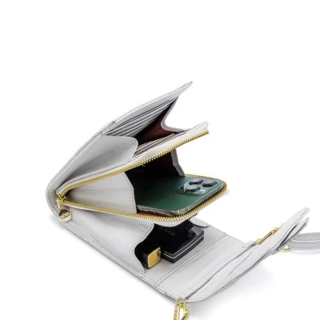 Stijlvol en praktisch telefoontasje van MŌSZ. De tas biedt niet alleen ruimte aan je mobiele telefoon (in alle maten) maar heeft ook 10 kaarthouders met RFID bescherming, wat het skimmen van je pasjes onmogelijk maakt. Daarnaast is er ruimte voor brief- en kleingeld, een speciaal opbergvakje voor je oordopjes en dan nog is er genoeg ruimte voor je dagelijkse ‘kleinere’ spulletjes. Het telefoontasje is op twee verschillende manieren te dragen. Crossbody dankzij de verstelbare en afneembare schouderriem en als handtas dankzij de korte schakelketting.