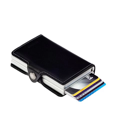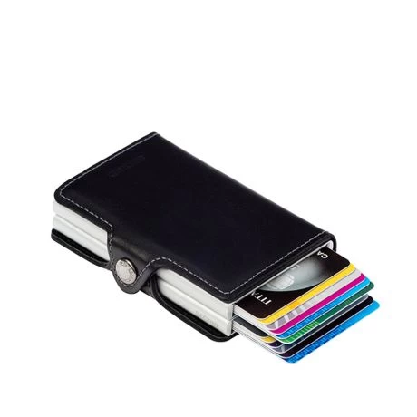 De Secrid Twinwallet bestaat uit twee cardprotectors in een leren hoes met druksluiting. Met de Twinwallet neemt u acht tot twaalf kaarten beveiligd mee. Het binnenwerk biedt daarnaast ruimte voor extra kaarten, papiergeld, bonnetjes, visitekaartjes en muntgeld. De Twinwallet is met haar 70 mm breedte en 25 mm dikte minstens de helft compacter dan een traditionele portemonnee met vergelijkbare inhoud. De twee stuks aluminium cardprotectors in de Twinwallet beschermen uw belangrijkste passen optimaal, zowel tegen buigen, slijten en breken als tegen ongewenst uitlezen van RFID-kaarten (zoals de OV-chipkaart, ID-kaart, de nieuwste creditcards en bedrijfspasjes). De Secrid Twinwallet is geschikt voor 8 tot 12 vlakke kaarten. Dankzij het unieke ontwerp schuiven de kaarten trapsgewijs naar buiten voor een eenvoudige selectie. De Secrid Twinwallet wordt geleverd in een mooie verpakking en daardoor ook zeer geschikt als uniek cadeau.